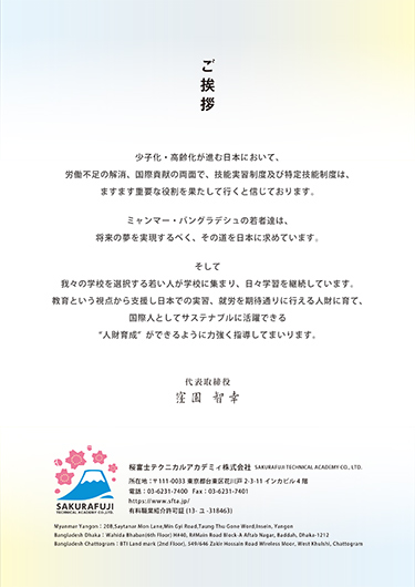 桜富士テクニカルアカデミィは、ミャンマー人皆様の“夢実現”の入り口である日本語や日本生活の基礎などの教育や活躍機会の提供などを通して、皆様の願望に応え変わりなく支援してまいります。